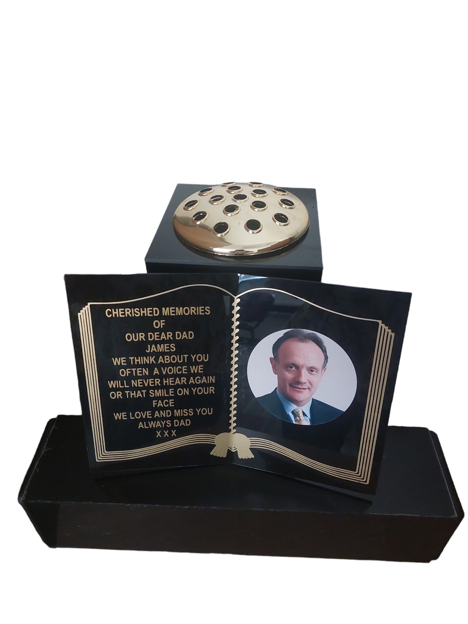 Small grave marker with memorial book and vase with your own inscription printed in gold. This version features one page of text and a second page containing a photograph.